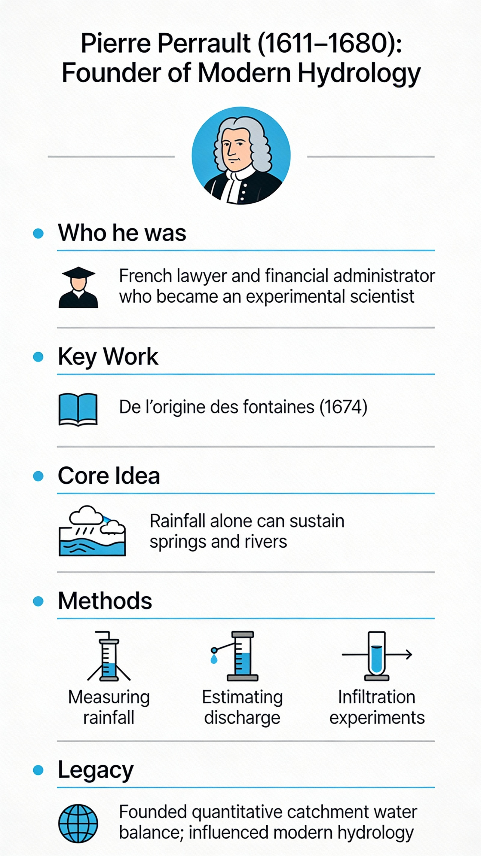 This scientist performed the first quantitative rainfall–runoff estimates for the Seine basin, showing that rainfall is sufficient to sustain river flow; often called founder of experimental hydrology